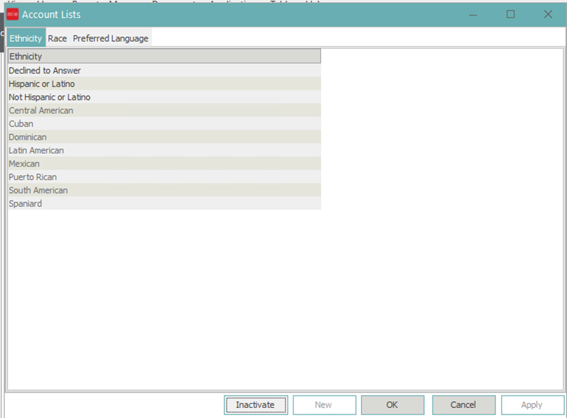 October 20, 2025 Account Lists Table Account Lists Table Information Account Lists Go to Tables-->Account-->Account Lists Users can create the list for the Ethnicity, Race, and Preferred Languauge fields in Account Information