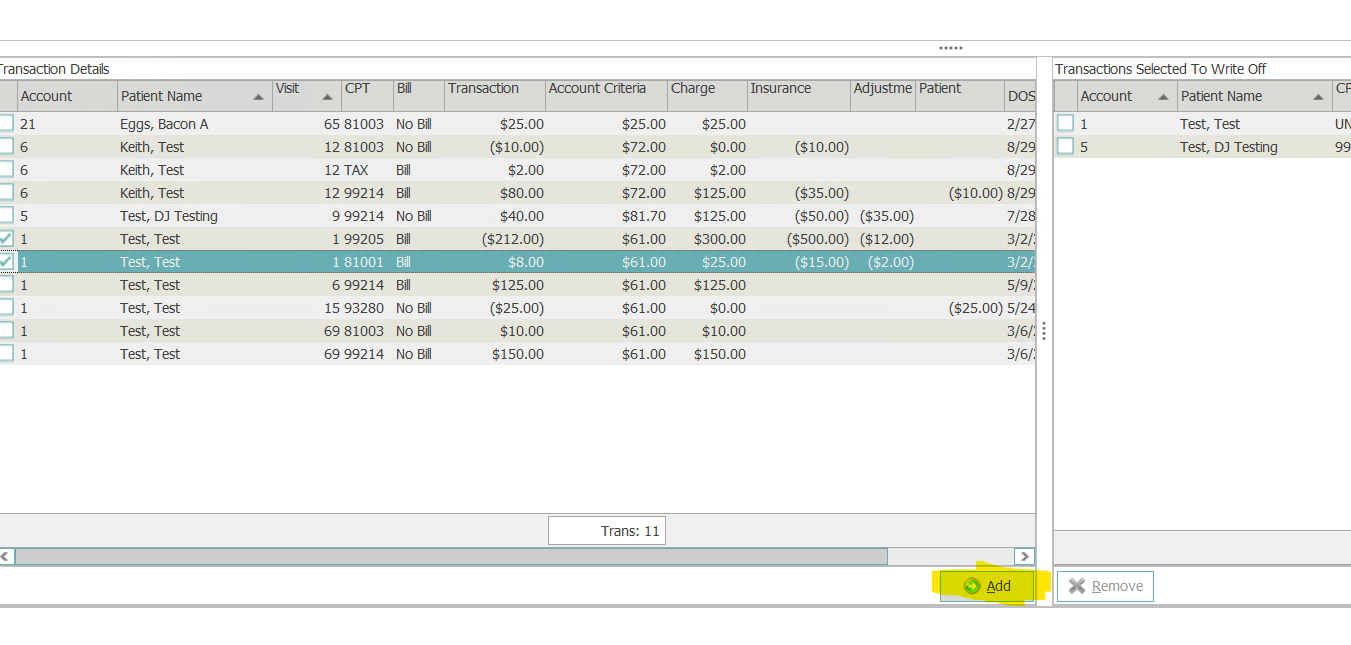 - Once transactions have been selected to write off they will be moved to this section by users clicking add