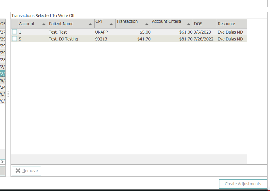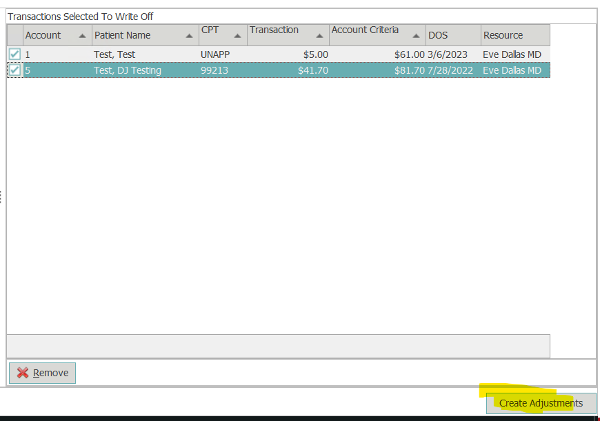 - Once code has been selected and transactions selected in Write off section Create Adjustments Button will appear