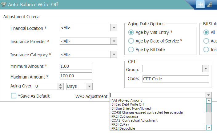 - Code - If only wanting to write off balances for transactions on a specific CPT code