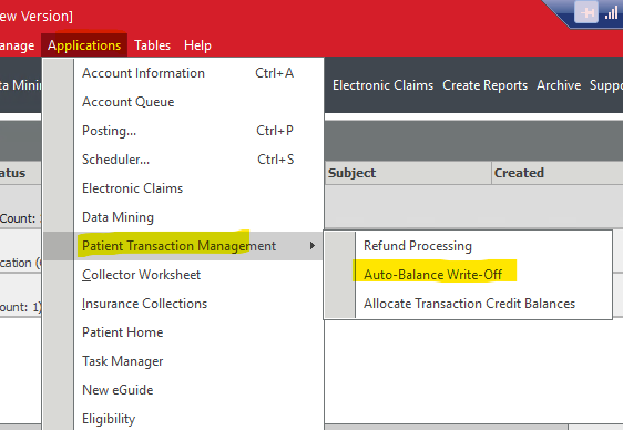 If users wish to write off balances for multiple accounts at the same time, such as small balances courtesy write off they can use the Auto Balance Write off tool under Application-->Patient Transaction Management.