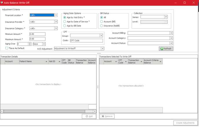 - Account Billing - If only wanting to write off balances for certain account billing (Never send statement, Bill Immediately, Bill after insurance etc)