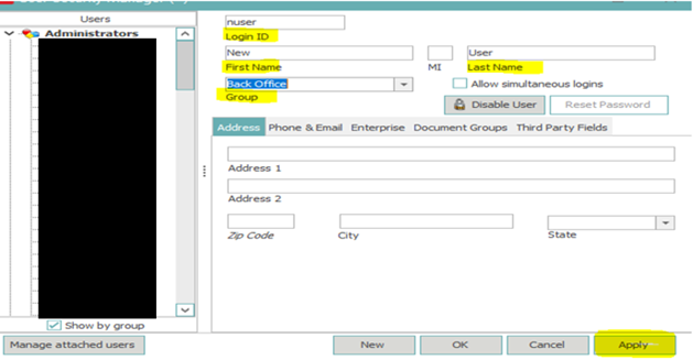 - Assign a login ID that they will use to login. Fill in the First Name, Last Name, and assign the group the user will belong to and click apply.