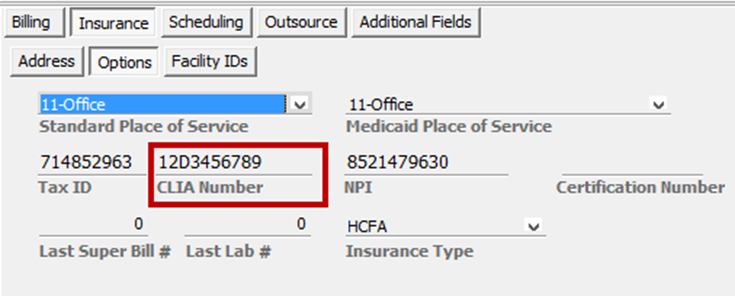 1. Within Tables>Location, the user will open the Service location. Under the Insurance>Options sub-tab insert the CLIA within the CLIA Number field.