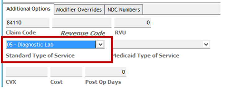 3. In Tables>CPTFees>Fee Schedule, search the CPT code needing CLIA. Open the Additional Options Tab and indicate 05-Diagnostic Lab in the Standard Type of Service field.