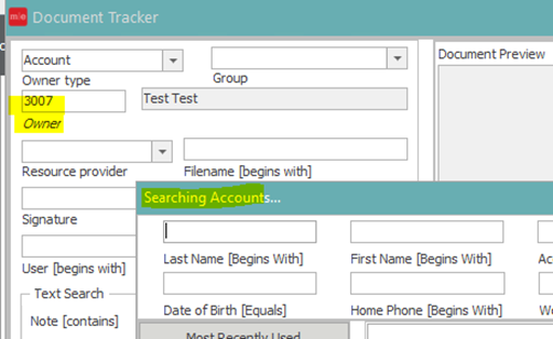 If the user knows the account number they will type it in the Owner Field. If the user needs to search by name click on the italicized word owner and it will bring up account search.