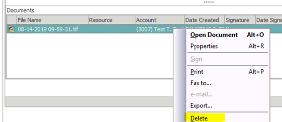 In the bottom section of the window, every document attached to the account in the owner field will be listed. Locate the document you wish to delete and right click on document and select delete.