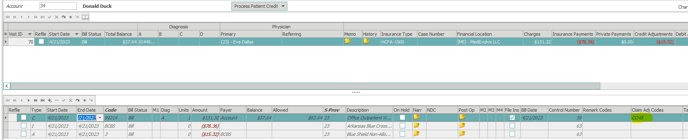 - The code after a moment will populate in the Claim Adj Codes column on the Charge transaction line.