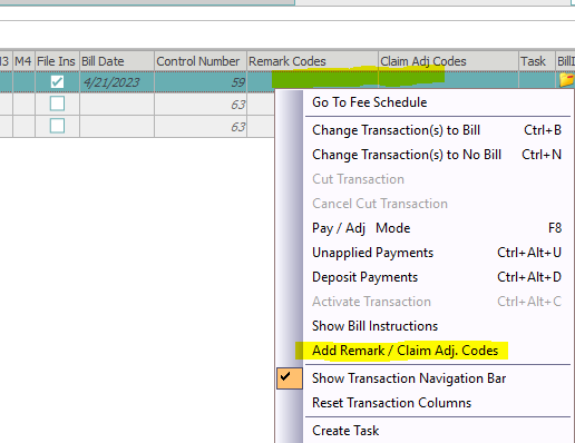 - Once visit is selected, right click on the transaction line that needs the claim adj/remark code or codes entered in and select Add Remark/Claim Adj. Codes