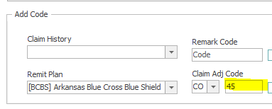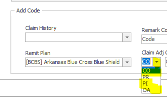 - In Claim Adj Code click the drop down to choose CO, PR, PI, or OA