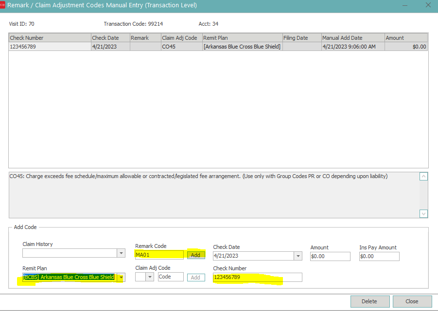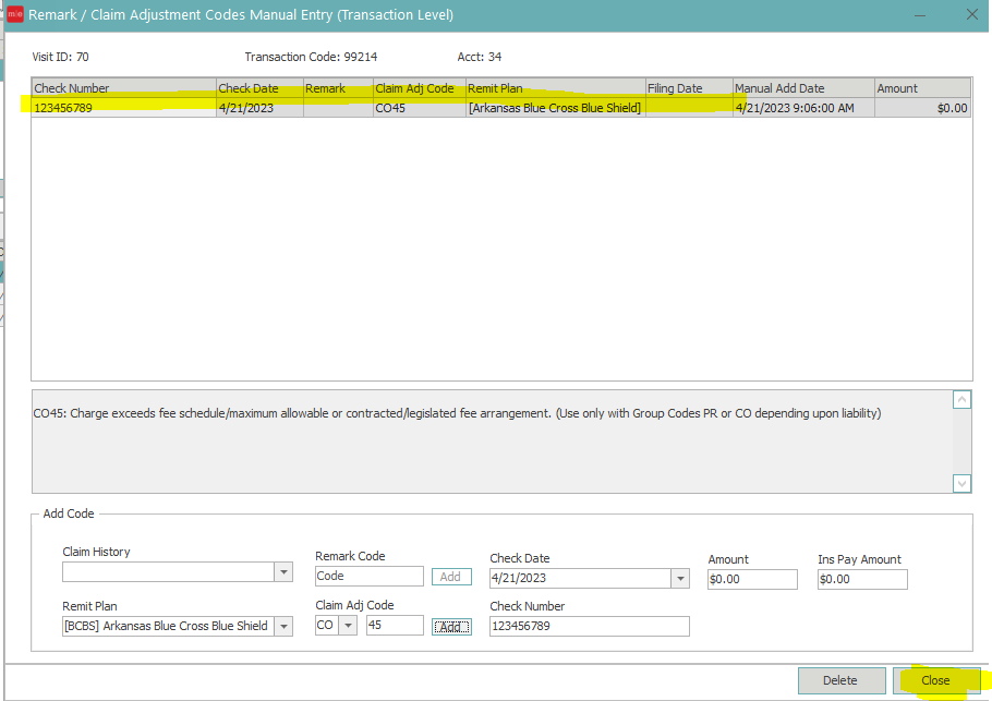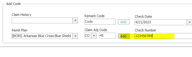 You can also add the remark codes at the same time as the adjustment column or separate. To add the Remark codes - You would fill in the remark code area as well and have the check number and date filled in and then select add.