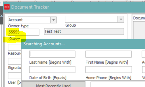 In the owner field type in the account number that the document is currently attached to. You can also click on the italicized word owner in order to search for the account if a number is not available.