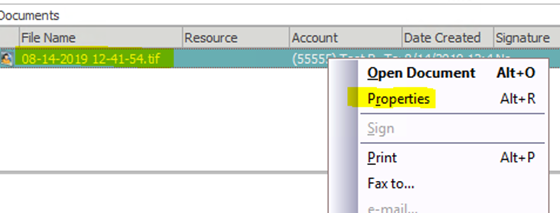 In the bottom section of the window there will be a list of every document attached to the account. Locate the document you wish to move to a different account, right click on the document and select properties.
