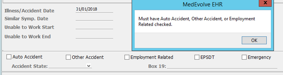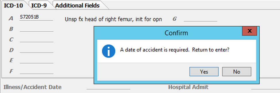 Within this setting when posting a claim and the diagnosis could possibly be part of an accident, users will receive a popup to enter an accident date.