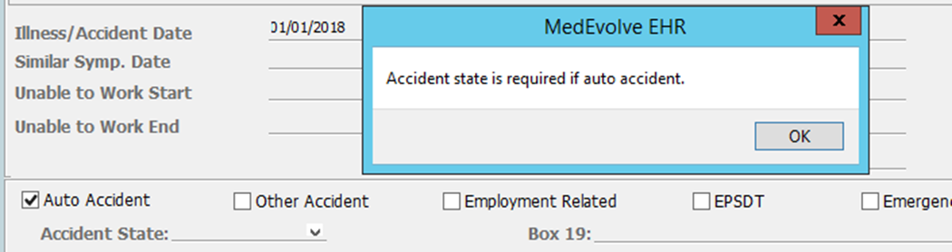 If user select an Auto Accident but do not indicate the state as required for MVA claims another popup will ask for the Accident State.