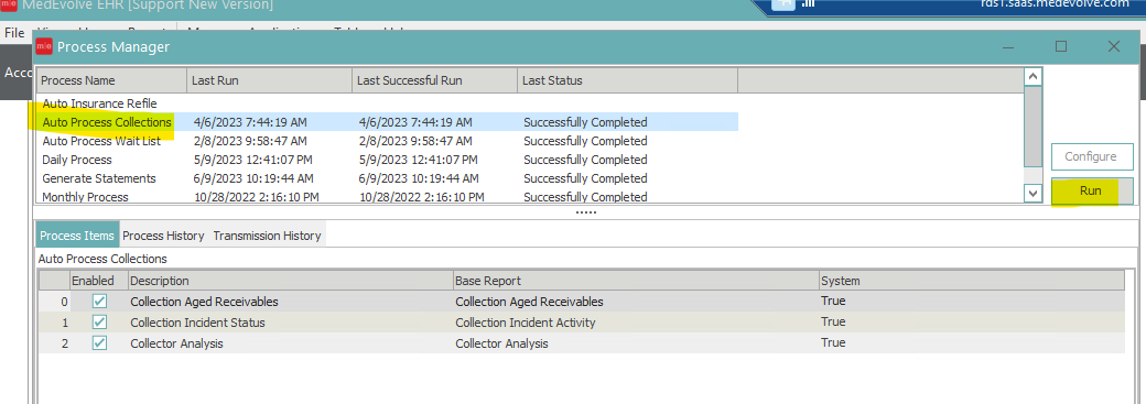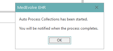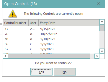 - If any of these controls have patient payments in them and you choose to continue with them still open, this could affect collections based on no pay days. Click Yes to continue if you do not need to close any controls. Click No if you would like to go close controls before running the process