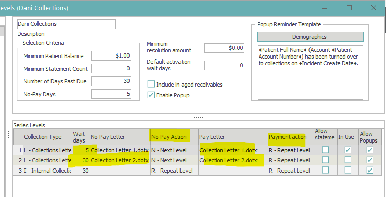 If no letters are attached in the Series and Levels then no letters will print. This will affect payment in the timeframe of the wait days period on that level line and also no payment within that time frame and then it will drop to next level as needed.
