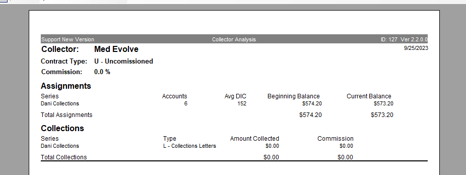 - Collector Analysis - This will show your collectors. It will also show how many accounts they are responsible for, average days in collections for those accounts, the beginning balance, the current balance. It will show the collector at the top, their assignments, and the how much they have collected.