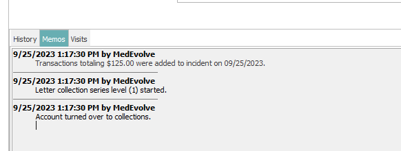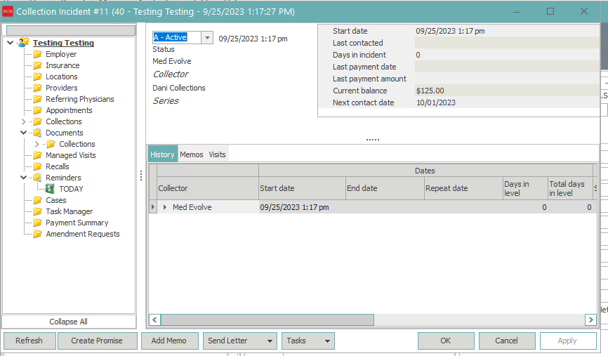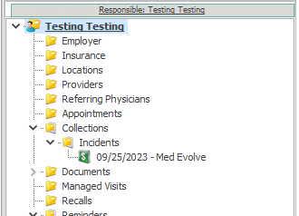 Once the collections process has been run, accounts that are in a collections incident will have on their account a record of the incident. Incidents will be listed on the left hand side of the account in the patient tree under Collections Section.
