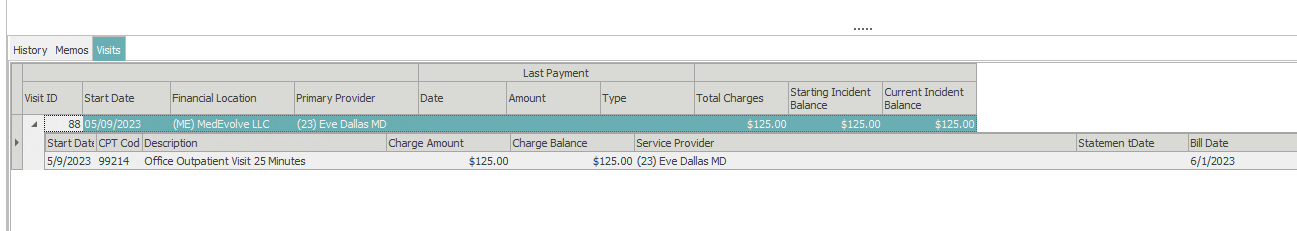 - Will show you the visit (s) included in the incident. If you click on the arrow on the visit it will show the transactions.
