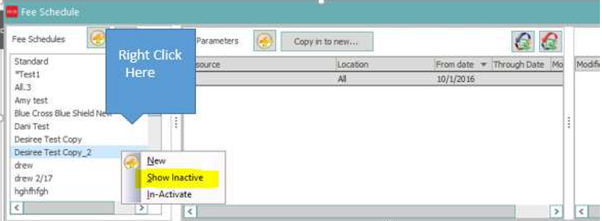 Please follow these steps in order to reactivate your fee schedule. Right click in the white area that have the fee schedule names listed and select Show Inactive.