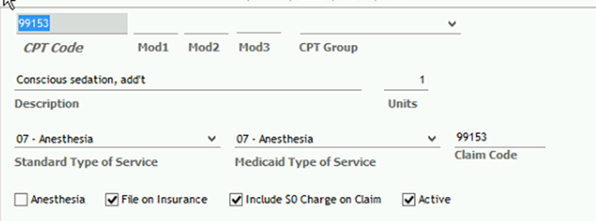 - CPT Code Setup o Standard Type of Service will be listed as 07-Anesthesia