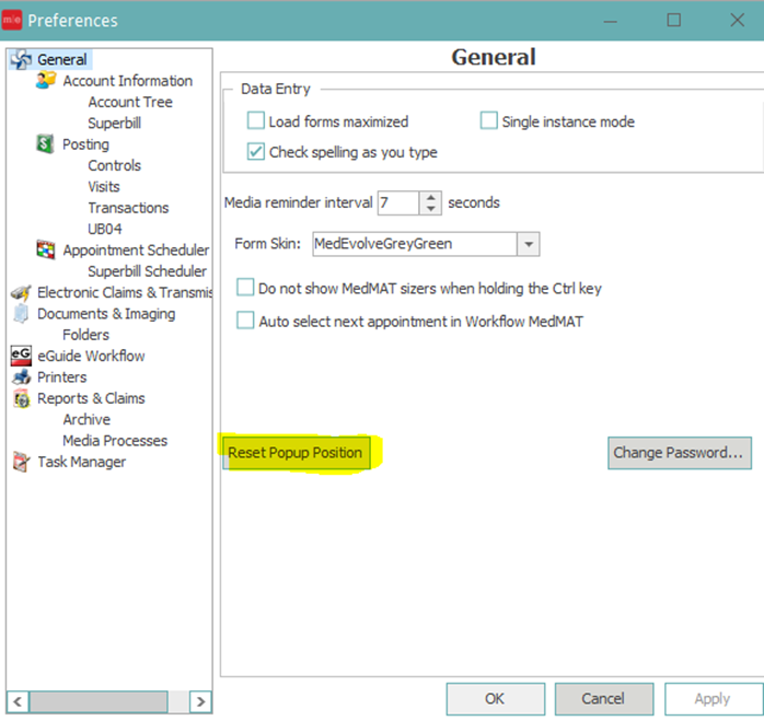 October 20, 2025 I am no longer seeing pop up reminders when opening accounts Pop Up Reminders Please navigate to the following location to reset your popup reminders within MedEvolve. View Tab-->Preferences. Select Reset Popup Position.