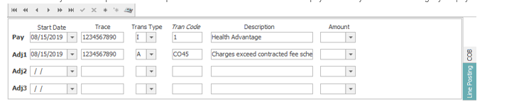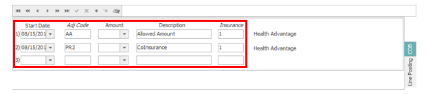 If the patient has a secondary insurance, you’ll need to add Coordination of Benefits details to the COB tab after you’ve saved your Line Posting payments and adjustments. The COB tab is located in the middle section, on the right side.