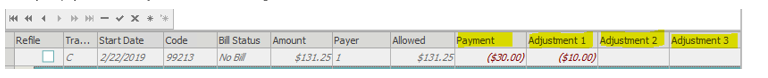 To save, click Apply, or press F9. The payments and adjustments will move below the corresponding charge lines when applied.
