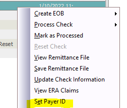 You can also update the check payer id in the case there are multiple insurance plans under the same payer on the same ERA. Right-click the ERA, and select Set Payer ID.