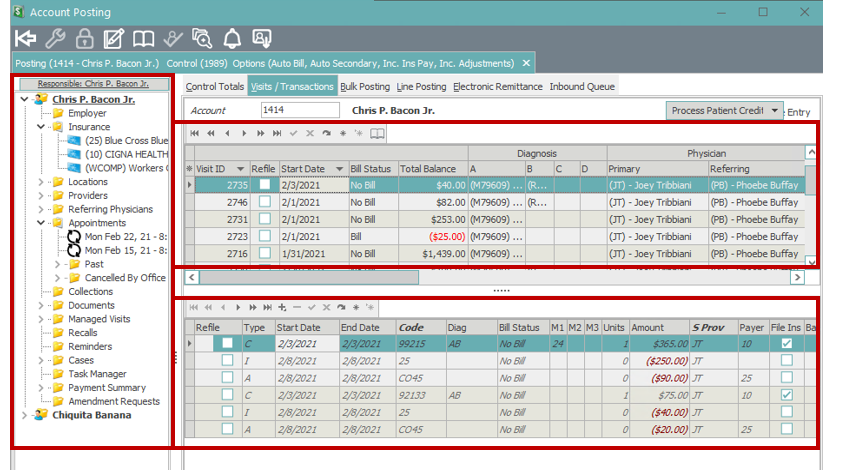 After the patient account is populated, any previous visits will appear in the upper Visit section of the window. All transactions related to the selected visit will appear in the bottom Transaction section of the window. The Patient Tree will also display to the left.