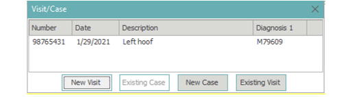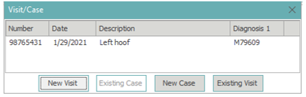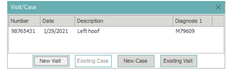 ** Existing cases – If a case exists on this account, the existing case will display in the center of the pop-up. To choose an existing case, highlight the case and select the Existing Case button or double left click on the case. The system will automatically create a visit populated with the information from the case details. To view or edit the visit information details, double left click on the visit or highlight the visit and select the book icon.