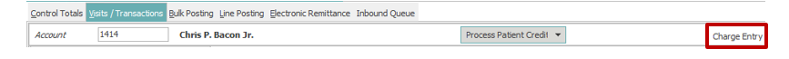 In the Visits/Transactions tab, Charge Entry is the default mode as seen top right corner of the screen.