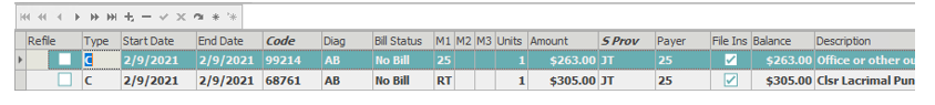 File Ins is required for any CPT code that needs to be filed on a claim to insurance. Insurance plan(s) must be enabled (have a check mark) on the visit information window. If File Insurance is unchecked, a claim will not be generated for that CPT code, but the code will remain in insurance responsibility/No Bill status until manually changed.