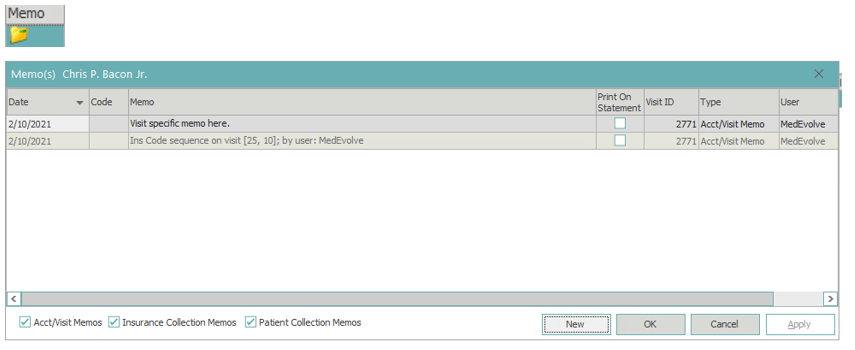 Memo displays any memos from ERA posting, or manually added memos, related to the visit. Double-click the memo folder to view/add memos to the visit.