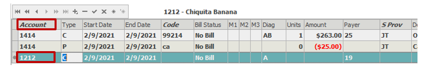 To switch to another patient account, click into the Account field (or press F2) and type in the next account number. Alternately to perform a patient search, click the italicized word Account or click into the Account field (or press F2) and press F3.