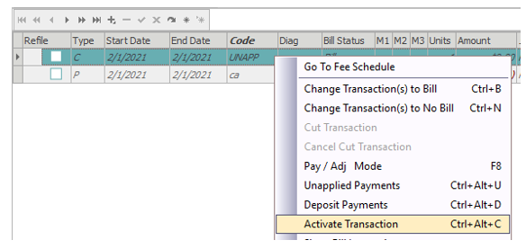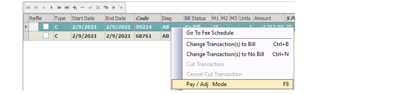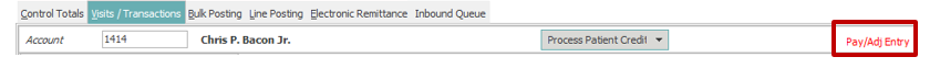 To post payments or adjustments to a charge in the Visits/Transactions tab, see instructions in the Patient Payment/Adjustment Posting section.