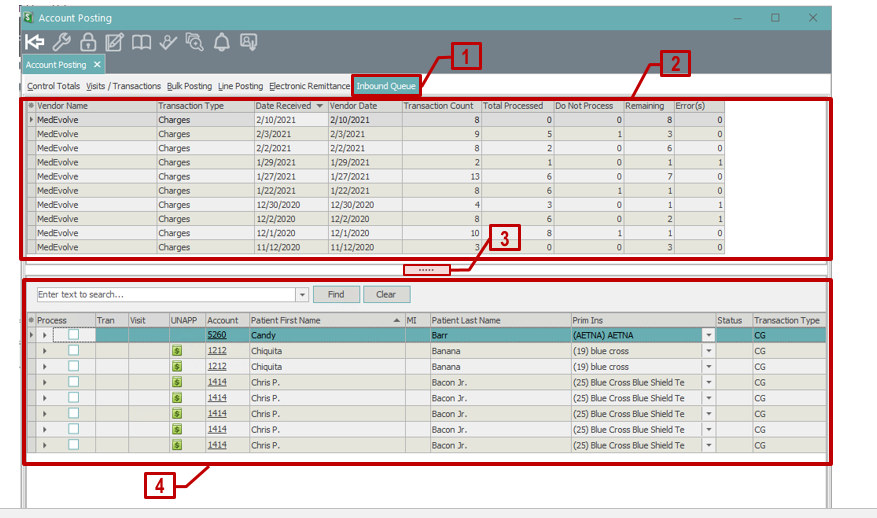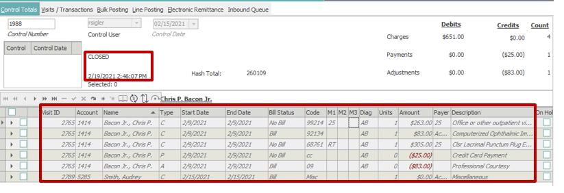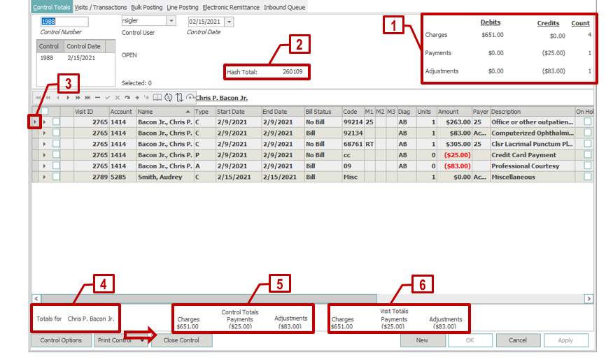 Control Totals and Visit Totals – when any patient transaction is selected (# 3 below), the Controls Totals (# 5 below) and the Visit Totals (# 6 below) are displayed for the selected patient (# 4 below).