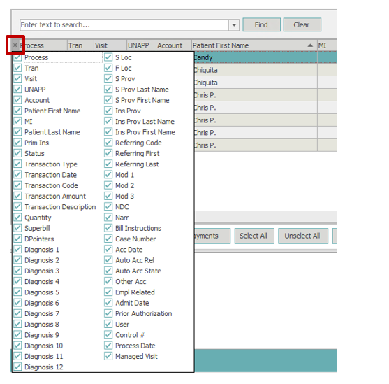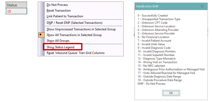 Status – If the system detects an error when processing the charges, this field will display an error code number that can be mapped to the Status legend in the transaction section right click menu. Also if a transaction is marked as Do Not Process, this field will display DNP when in the processed view.