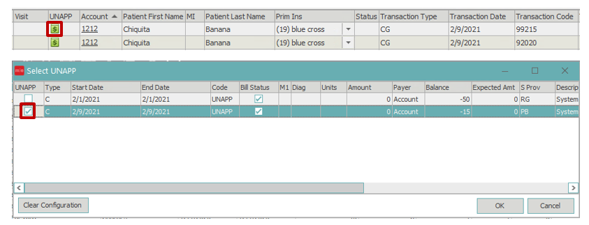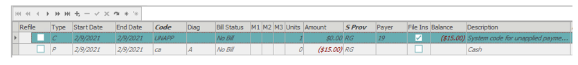 View of transactions from Visits/Transactions screen showing unapplied payment (before applying unapplied payment in inbound queue)