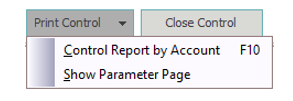 From the bottom left, select Print Control. There are two options. The default report is Control Report by Account. Or to choose different parameters, select the Show Parameter Page option.