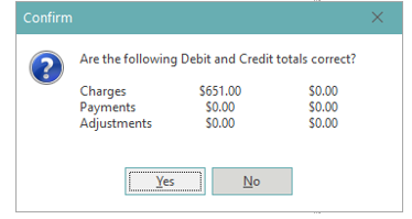 A confirmation pop-up will appear. Select Yes to confirm that the Debit and Credit totals on Charges, Payments and Adjustments are correct.