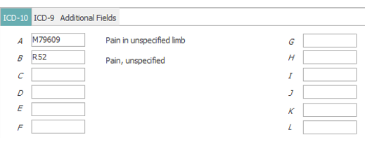 ICD-10 tab provides up to 12 diagnosis codes to be sent on the claim. Enter each diagnosis code – without decimals – in the appropriate lettered field.