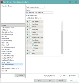 - User will then need to select New at the bottom of this window. Choose a name for the new user group, choose the group description and then assign either to a group as a whole or users individually by expanding the group and select only certain users. We recommend naming the group something that correlates with the tasks that will be assigned to that group or individuals within that group. For example if it is to verify Eligibility the name could be Eligibility. Users can either choose to display the security by groups or users. This comes from the groups assigned in Manage-->Security.