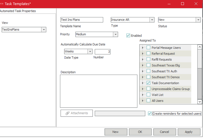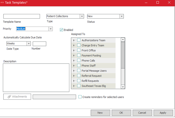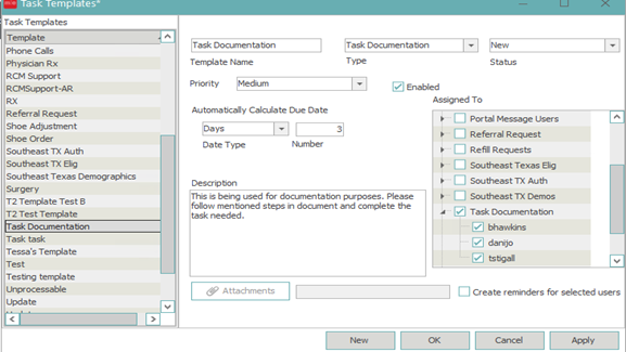 - Task Templates Task templates are designed for being able to select a premade message for what needs to be done for the tasks assigned. They are attached to the types and assigned to the group. Go to Tables-->Task Manager-->Task Templates. Select New at the bottom of the window. Template Name will need to be chosen, for type select the type that this template will be attached to. Status will be defaulted to New. Select Priority and the calculation for due date (days, weeks, month) and the number for the date type. In the description users can type what needs to be done in order to complete the task. The Task Template will need to be assigned to the group or individual users.
