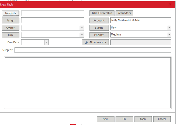 - Lastly if users have the Task Manager MedMat open on their home page they can also click the plus sign for new tasks and assign the information and the account the task will be attached to.