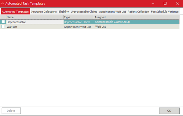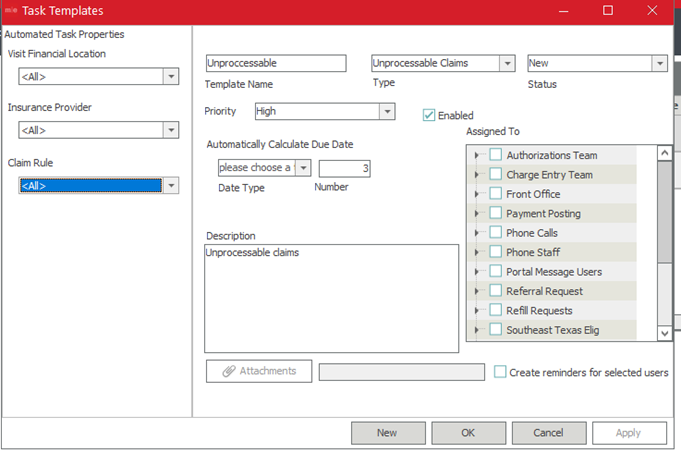 - Unprocessable Claims Automated Tasks - Users can select from a list of claim rules to create the task templates for Unprocessable Claims. Users can select a single rule or multiple rules and assign a user or User Group. Tasks will be auto created during the Day End and Month End Processes.