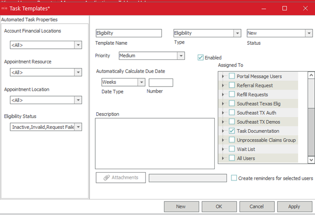 - Eligibility Automated Task - Selecting from a list of Eligibility Filter Parameters and task user groups a user can create an automated task template. Tasks will be auto created during the Eligibility process. Users can set up tasks for all results or just failed results.