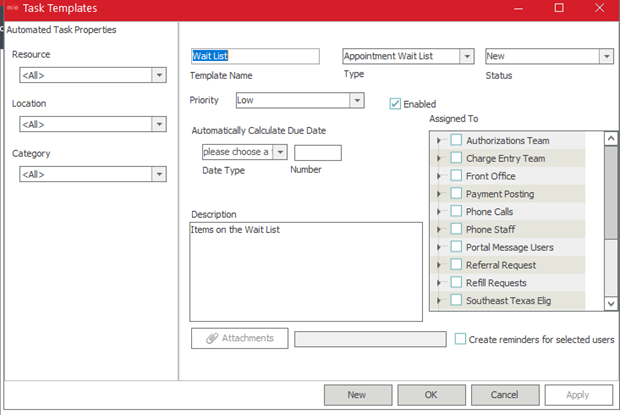 - Appointment Wait List Automated Task - A list of Appointment Resources, Locations, and Categories is available for selection. Users can select filters and assign to a user or user group. Tasks will be auto created during the Auto Process Wait List Generation.