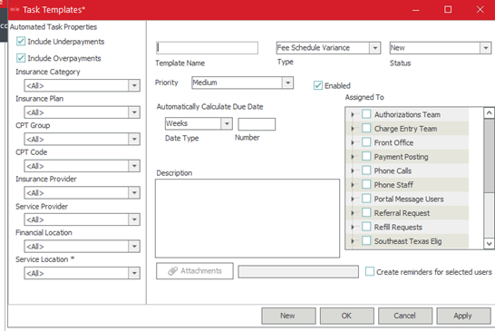 - Fee Schedule Variance Automated Task - A list of Fee Schedule Report filter parameters is available for selection. Users can select from filter options and assign to a user or user group. Fee Schedule tasks will be created by the MedEvolve Automation Service which runs nightly. Logic for service is to review Insurance Payments with posted date of previous day where the payment was from the Primary Insurance on the visit and then determine if the allowed amount provider on the remittance (or manually added) is not equal to the allowed amount in the fee schedule for the related charge.